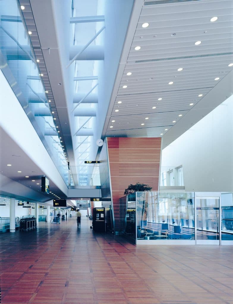 The 9,000 m² expansion of Copenhagen Airport, designed by KHR Architecture, adds a new finger linking terminals A, B, and C. It’s the first building in Kastrup designed to handle both Schengen and non-Schengen traffic, with non-Schengen passengers on the upper level. A system of high glass partitions ensures separation, supported by stairwells and elevators outside the façade. Non-Schengen passengers cross the lounge via footbridges to a balcony level with moving walkways to passport control. The Schengen area also features moving walkways through the 200 m connector. ARX (formerly KHR) has also worked on Arlanda, Billund, and Copenhagen Metro projects.